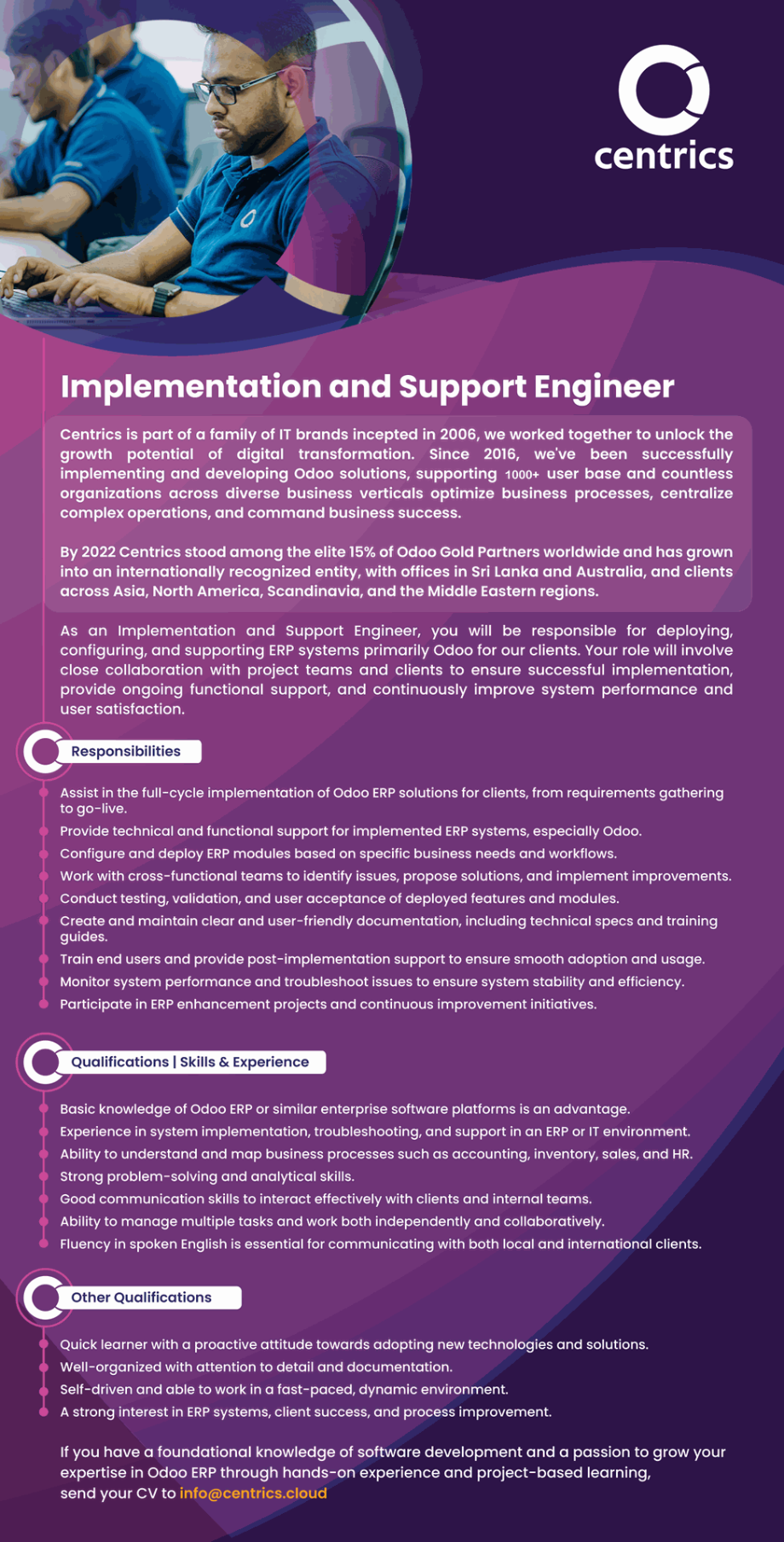 We at Centrics pride ourselves on being a leading Odoo Gold Partner. We are a global IT consulting company that focuses on the implementation of the Odoo ERP system, we also offer other related services such as IT support, system integration, custom automation, app development, business consulting, and hosting solutions. Our goal is to support our clients with effective digital transformation through smart IT solutions and streamlined business workflows, enabling improved business efficiency, cost-saving, and operational productivity.