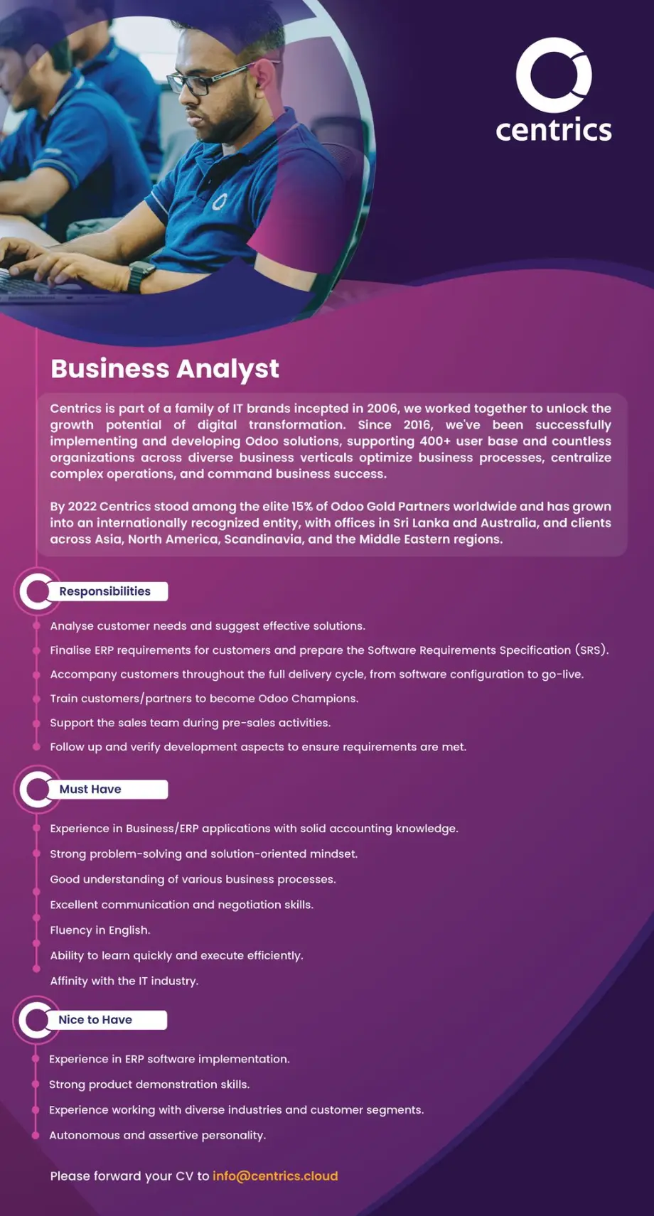 We at Centrics pride ourselves on being a leading Odoo Gold Partner. We are a global IT consulting company that focuses on the implementation of the Odoo ERP system, we also offer other related services such as IT support, system integration, custom automation, app development, business consulting, and hosting solutions. Our goal is to support our clients with effective digital transformation through smart IT solutions and streamlined business workflows, enabling improved business efficiency, cost-saving, and operational productivity.