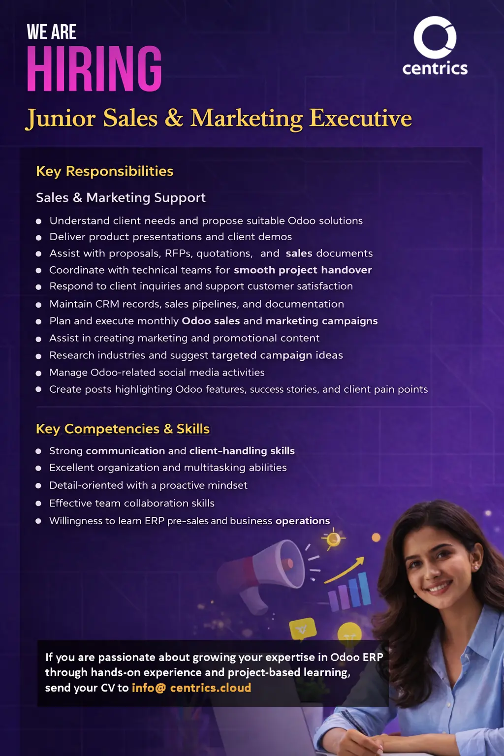 We at Centrics pride ourselves on being a leading Odoo Gold Partner. We are a global IT consulting company that focuses on the implementation of the Odoo ERP system, we also offer other related services such as IT support, system integration, custom automation, app development, business consulting, and hosting solutions. Our goal is to support our clients with effective digital transformation through smart IT solutions and streamlined business workflows, enabling improved business efficiency, cost-saving, and operational productivity.